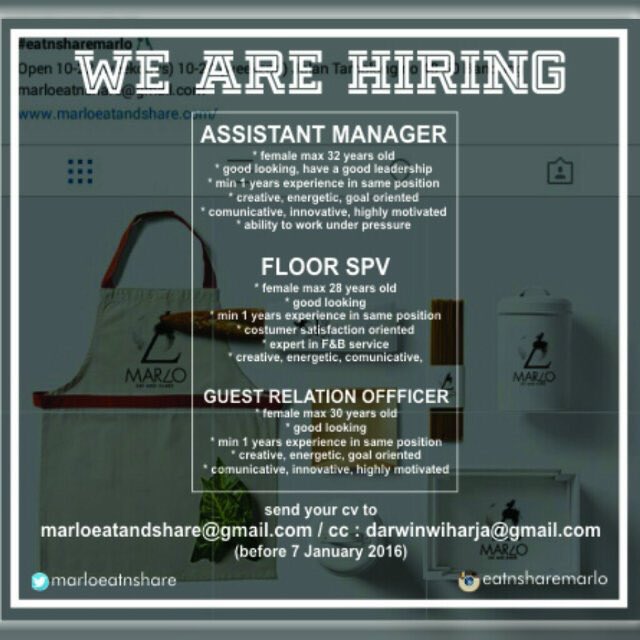 Lowongan kerja di @eatnsharemarlo [5 Januari 2016]